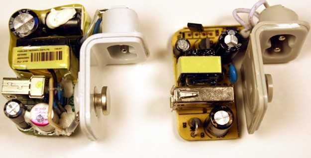 На фото слева оригинальный зарядное устройство известного производителя, справа - подделка. Как видим, элементная база существенно отличается.